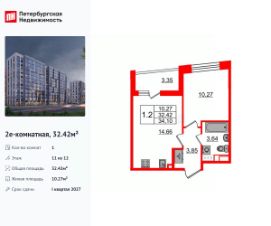 Удобная, классическая, функциональная европланировка, большая кухня-гостиная 14.66 м², вместительная прихожая 3.85 м². Общая площадь квартиры - 32.42 м², жилая 10.27 м², высота потолка 2.77 м.