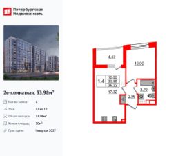 Удобная, классическая, функциональная европланировка, большая кухня-гостиная 17.32 м², вместительная прихожая 2.96 м². Общая площадь квартиры - 33.98 м², жилая 10 м², высота потолка 3 м.
