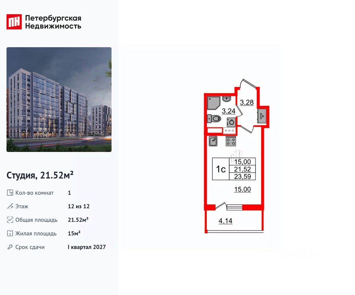 Удобная, классическая, функциональная европланировка, просторная прихожая 3.28 м². Общая площадь студии - 21.52 м², жилая 15 м², высота потолка 3 м.