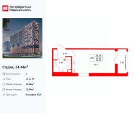 Удобная, классическая, функциональная европланировка, вместительная прихожая 2.92 м². Общая площадь студии - 24.44 м², жилая 18.14 м², высота потолка 2.77 м.