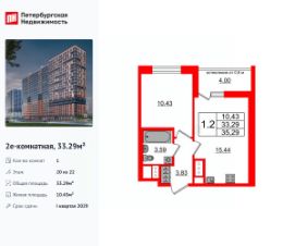 Удобная, классическая, функциональная европланировка, большая кухня-гостиная 15.44 м², вместительная прихожая 3.83 м². Общая площадь квартиры - 33.29 м², жилая 10.43 м², высота потолка 2.77 м.