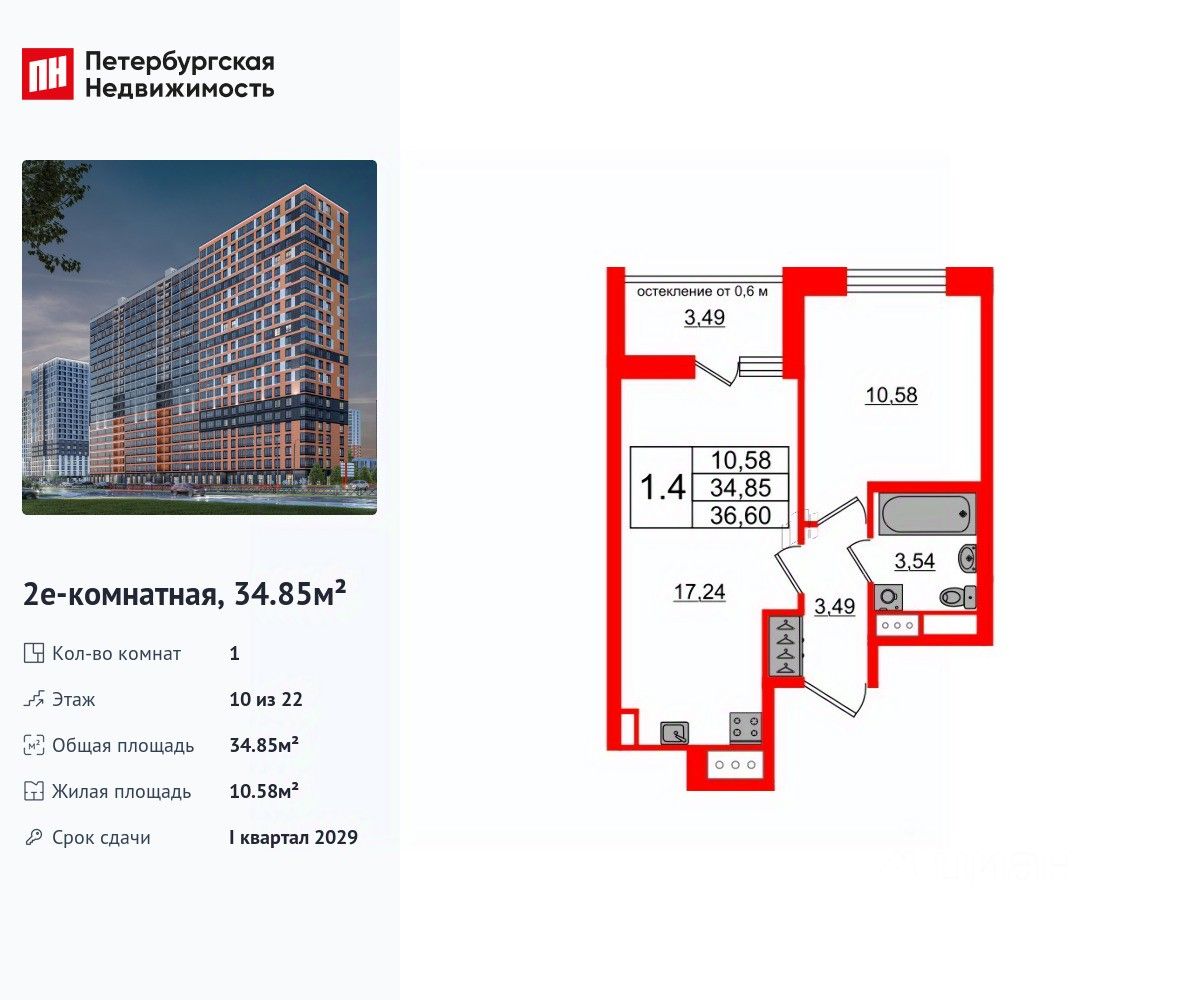 Удобная, классическая, функциональная европланировка, большая кухня-гостиная 17.24 м², вместительная прихожая 3.49 м². Общая площадь квартиры - 34.85 м², жилая 10.58 м², высота потолка 2.77 м.