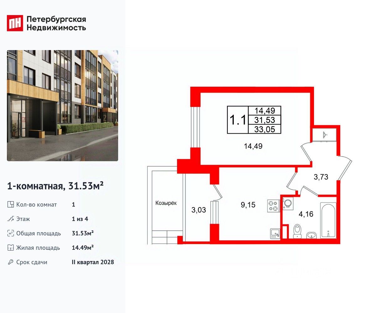 Удобная, классическая планировка, кухня 9.15 м², вместительная прихожая 3.73 м². Общая площадь квартиры - 31.53 м², жилая 14.49 м², высота потолка 2.77 м.