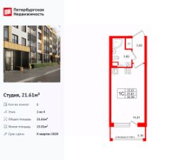 Удобная, классическая, функциональная европланировка, вместительная прихожая 3 м². Общая площадь студии - 21.61 м², жилая 15.01 м², высота потолка 2.77 м.