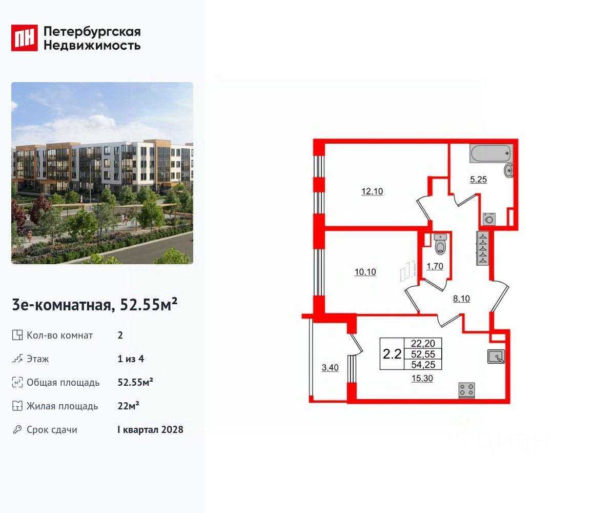 Удобная, классическая, функциональная европланировка, большая кухня-гостиная 15.5 м², просторная прихожая 7.6 м². Общая площадь квартиры - 52.55 м², жилая 22 м², высота потолка 2.78 м.