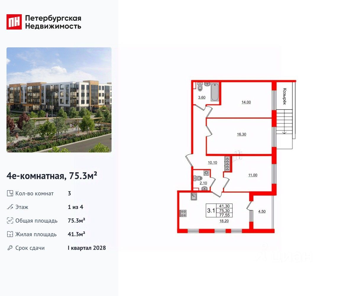 Удобная, классическая, функциональная европланировка, большая кухня-гостиная 18.2 м², вместительная прихожая 10.1 м². Общая площадь квартиры - 75.3 м², жилая 41.3 м², высота потолка 2.78 м.