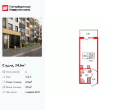 Удобная, классическая, функциональная европланировка, вместительная прихожая 3 м². Общая площадь студии - 24.6 м², жилая 18.1 м², высота потолка 3.04 м.