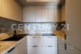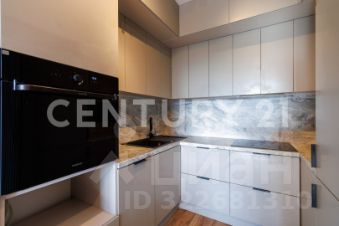 -кухня-гостиная со встроенным кухонным гарнитуром, где разместилась вся встроенная кухонная техника: