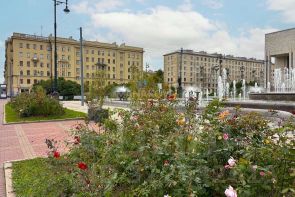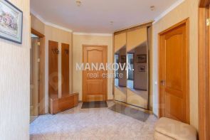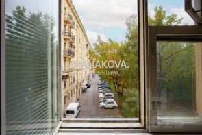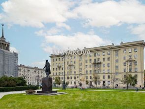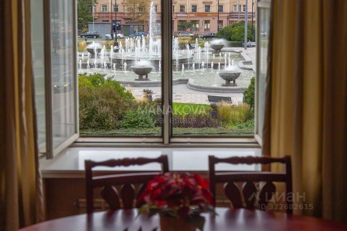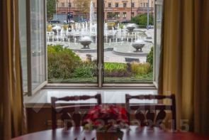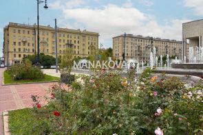 Площадь — 81 м² , высокие потолки, двухсторонняя планировка, вид на Национальную библиотеку и фонтаны в Парке Победы .