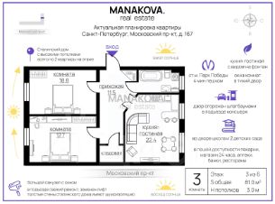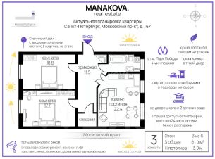О квартире: гостиная-кухня 22,4 м² , две спальни 17,8 м² и 18,8 м².