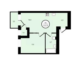 Квартира с панорамными окнами и уникальной планировкой: просторная кухня-гостиная (18 м²), спальня (11,9 м²), ванная (5,7 м²), лоджия и просторная терраса.