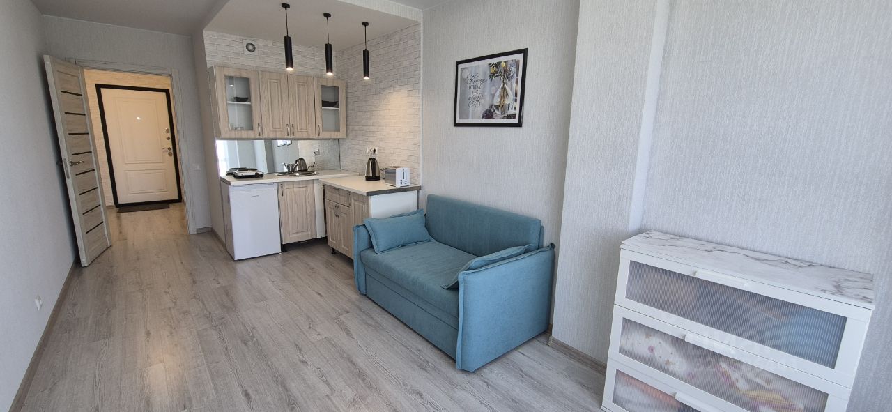 Общая площадь 23.2 кв. м. Кухня - гостиная 15 кв. м. Прихожая 4 кв. м. Санузел совмещенный 4.2 кв.м. Высота потолков 2.6 метра. 12-й этаж 14-ти этажного панельного дома. Дом 2021 года постройки. Окна во двор.