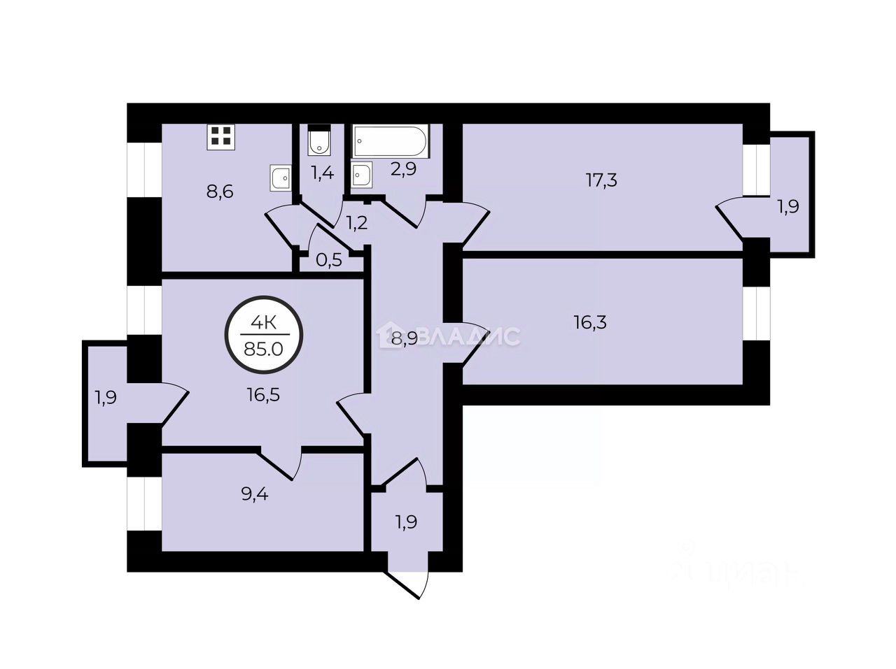 Жилая площадь составляет 59,5 кв. м, а кухня — 8,6 кв. м. Комнаты изолированы, что обеспечивает комфорт и уединение. Два балкона предлагают отличные возможности для отдыха и наслаждения видами на улицу и двор.
