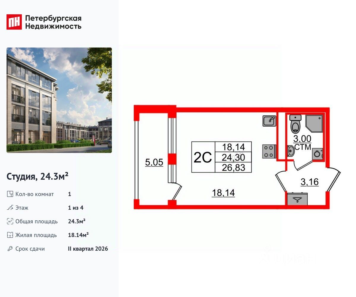 Удобная, классическая, функциональная европланировка, вместительная прихожая 3.16 м². Общая площадь студии - 24.3 м², жилая 18.14 м², высота потолка 2.75 м.