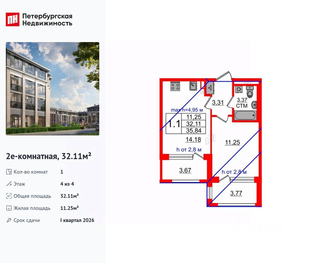 Удобная, классическая, функциональная европланировка, большая кухня-гостиная 14.18 м², вместительная прихожая 3.31 м². Общая площадь квартиры - 32.11 м², жилая 11.25 м².