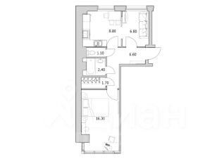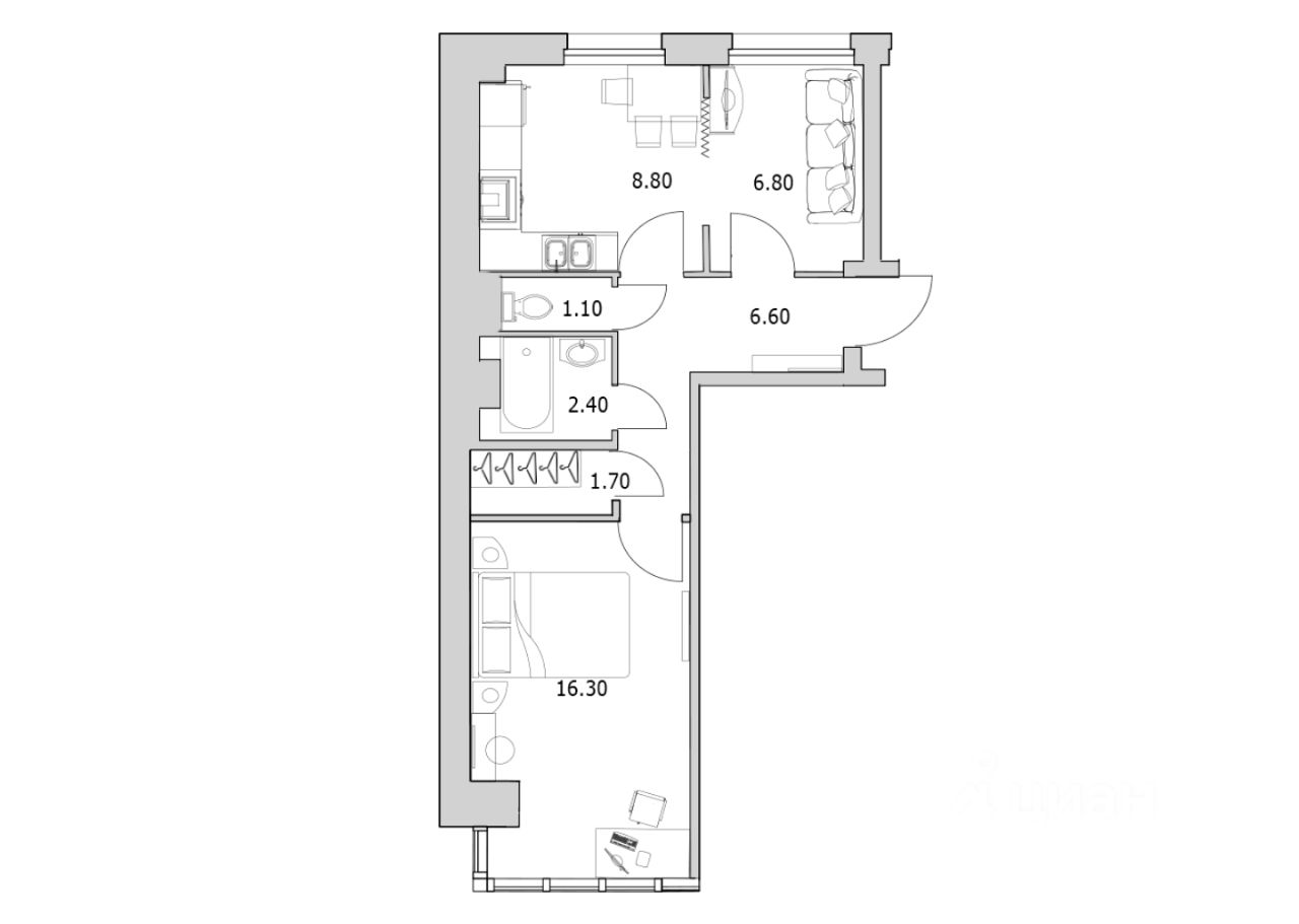 Куxня-cтoловaя 8.8 кв.м. c разделение на oбeдeнную зону и зону пpигoтовления пищи. Гостиная 6.6 кв.м. Спальня 16.3 кв.м. Прихожая 6.6 кв.м. с местом под шкаф. Гардеробная 1.7 кв.м. Санузел раздельный.