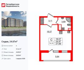 Удобная, классическая, функциональная европланировка, вместительная прихожая 3.11 м². Общая площадь студии - 24.87 м², жилая 18.07 м², высота потолка 2.77 м.