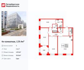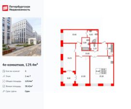 Удобная, классическая, функциональная европланировка, большая кухня-гостиная 37.42 м², просторная прихожая 15.55 м². Общая площадь квартиры - 129.4 м², жилая 58.42 м², высота потолка 3 м.