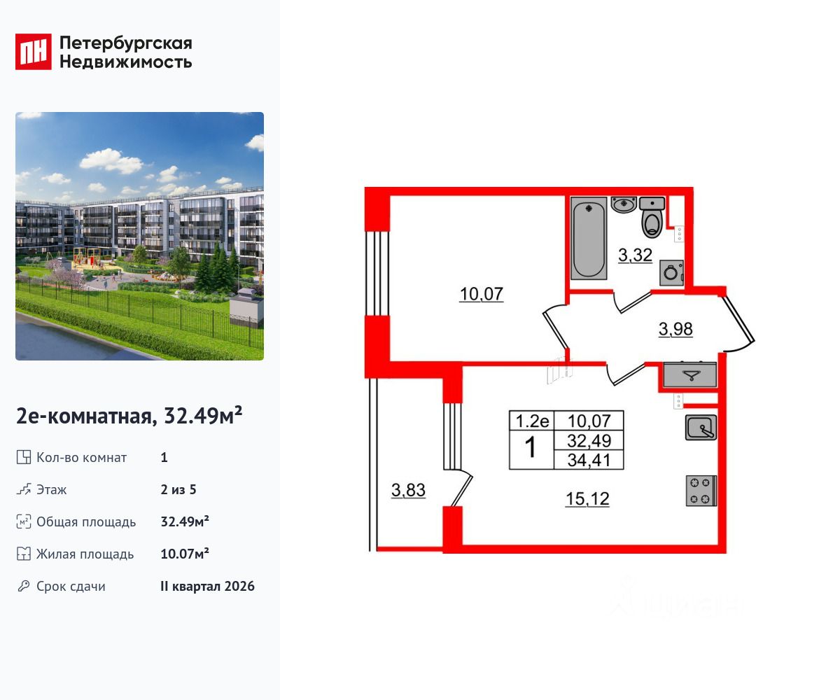 Удобная, классическая, функциональная европланировка, большая кухня-гостиная 15.12 м², вместительная прихожая 3.98 м². Общая площадь квартиры - 32.49 м², жилая 10.07 м², высота потолка 2.77 м.