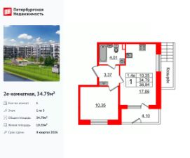 Удобная, классическая, функциональная европланировка, большая кухня-гостиная 17.06 м², вместительная прихожая 3.37 м². Общая площадь квартиры - 34.79 м², жилая 10.35 м², высота потолка 2.77 м.