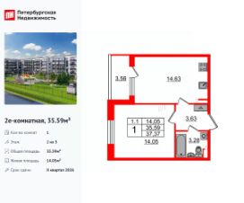 Удобная, классическая, функциональная европланировка, большая кухня-гостиная 14.63 м², вместительная прихожая 3.63 м². Общая площадь квартиры - 35.59 м², жилая 14.05 м², высота потолка 2.77 м.