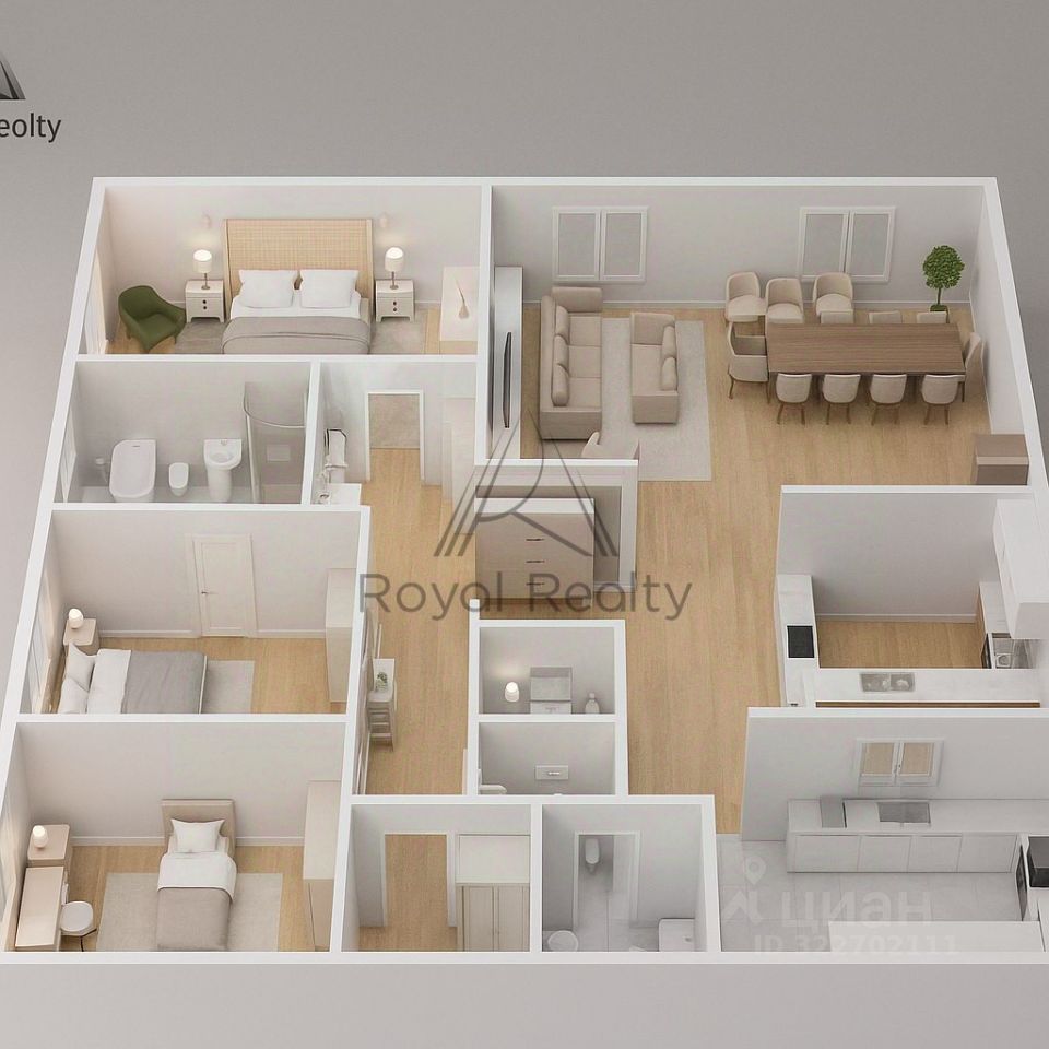 Три изолированные спальни: Хозяйская спальня (22,7 м²) с собственной гардеробной (6,9 м²) и санузлом (6,9 м²), и две детские комнаты (16,3 м² и 15 м²).