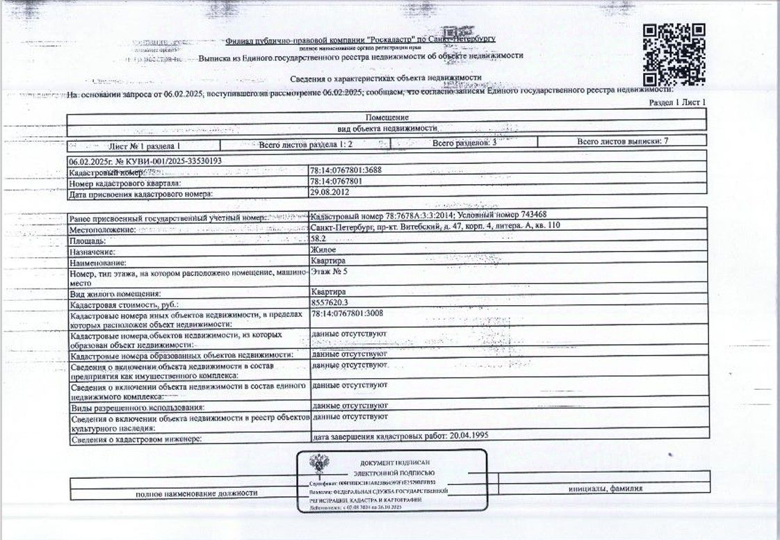квартира по адресу: г. Санкт-Петербург, Витебский пр., д.47, корп.4, лит. А, кв.110, общ. пл. 58," кв.м., кадастровый номер 78:14:0767801:3688