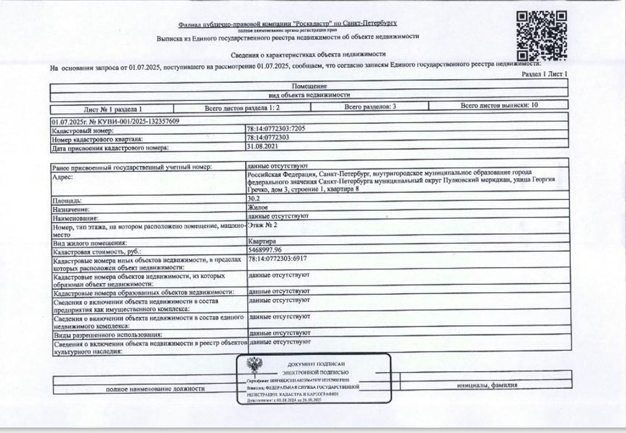 квартира по адресу: г. Санкт-Петербург, внутригородское муниципальное образование города федерального значения Санкт-Петербурга муниципальный округ Пулковский меридиан, ул. Георгия Гречко, д.3, стр.1, кв.8, общ. пл. 30.2 кв.м., кадастровый номер 78:14:0772303:7205