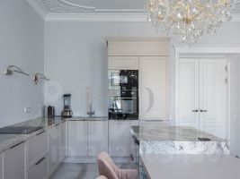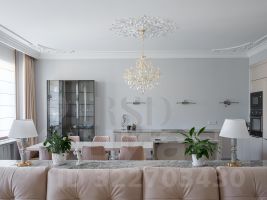 Квартира расположена на 4 этаже с видом как на улицу, так и во двор. Большая кухня гостиная 54,3м2, две спальни 27,4 м2 и 12м2, два санузла, вместительные гардеробные. В 2022 году был проведен полный капитальный ремонт с заменой всех инженерных коммуникаций, стен, перекрытий, окон и электрического ввода до счетчика. Только самые высококачественные и проверенные временем материалы были использованы для отделки. Важно отметить, что на гипсовую лепнину было потрачено порядка миллиона рублей, подчеркивая роскошь и элегантность каждой детали.