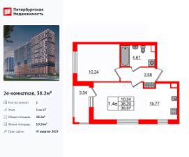 Удобная, классическая, функциональная европланировка, большая кухня-гостиная 19.77 м², вместительная прихожая 3.58 м². Общая площадь квартиры - 38.2 м², жилая 10.24 м², высота потолка 2.77 м.