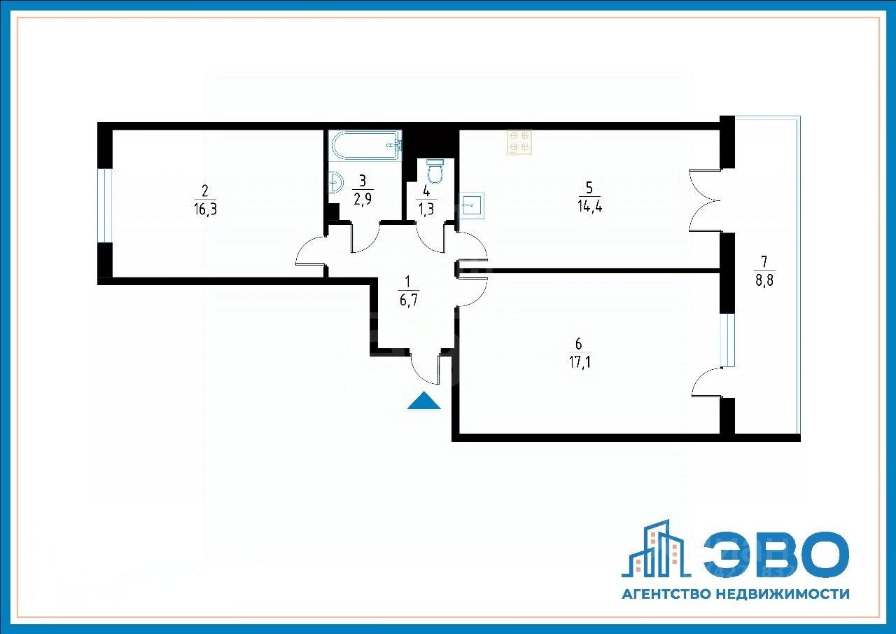 площадь комнат 17,1 и 16,3 кв.м., просторная кухня 14,4 кв.м.