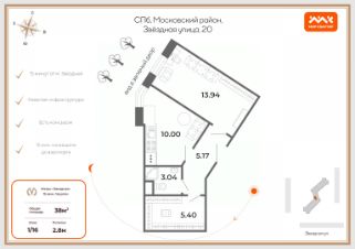 Общая площадь квартиры составляет 38 м². Комната правильной формы, кухня площадью 10 м², в квартире есть метро под просторную гардеробную или постирочную площадью почти 6м2.