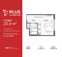 Просторная однокомнатная квартира-студия с отделкой в ЖК "PLUS Пулковский" на 5 этаже. Общая площадь: 25.9 кв.м., площадь гостиной 16.8 кв.м., из которых 5 кв.м. выделено под кухонную зону. Все окна выходят на одну сторону. В квартире один совмещенный санузел. Высота потолков 2.89 м.