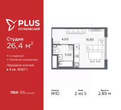 1-комн. квартира-студия от застройщика с отделкой в ЖК "PLUS Пулковский" на 2 этаже. Общая площадь: 26.4 кв.м., площадь гостиной 16.8 кв.м., из которых 5 кв.м. выделено под кухонную зону. Все окна выходят на одну сторону. В квартире один совмещенный санузел. Высота потолков 2.89 м.