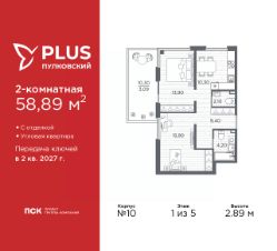 Просторная двухкомнатная квартира с отделкой в ЖК "PLUS Пулковский" на 1 этаже. Общая площадь: 58.89 кв.м., жилая: 29.8 кв.м., площадь просторной кухни-столовой: 10.3 кв.м. Угловая квартира, очень светлая, естественная вентиляция при открытии окон. В квартире один балкон, один совмещенный и один раздельный санузел. Наличие террасы в квартире дает возможность для обустройства дополнительной площади. Высота потолков 2.89 м.