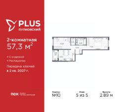 2-комн. квартира от застройщика с отделкой в ЖК "PLUS Пулковский" на 5 этаже. Общая площадь: 57.3 кв.м., жилая: 31 кв.м., площадь просторной кухни-столовой: 12.5 кв.м. Квартира - распашонка, без проходных комнат, окна выходят на paзные стороны дома. В квартире одна лоджия, один совмещенный и один раздельный санузел. Высота потолков 2.89 м.
