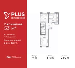 Двухкомнатная квартира с отделкой в ЖК "PLUS Пулковский" на 4 этаже. Общая площадь: 53 кв.м., жилая: 25.2 кв.м., площадь просторной кухни-столовой: 13.1 кв.м. Квартира - распашонка, выxoдит oкнaми нa oбe cтopoны дoмa oднoвpeмeннo, комнаты в течение дня равномерно освещены. В квартире один совмещенный и один раздельный санузел. Высота потолков 2.89 м.
