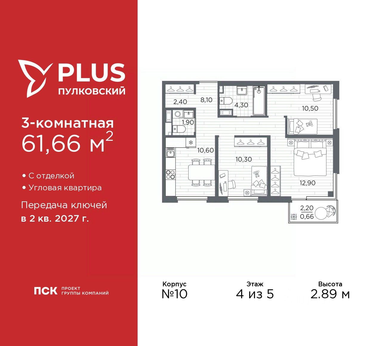 Просторная трехкомнатная квартира с отделкой в ЖК "PLUS Пулковский" на 4 этаже. Общая площадь: 61.66 кв.м., жилая: 33.7 кв.м., площадь просторной кухни-столовой: 10.6 кв.м. Угловая квартира, идеально подойдет любителям тишины и панорамных видов. В квартире один балкон, один совмещенный и один раздельный санузел. Высота потолков 2.89 м.