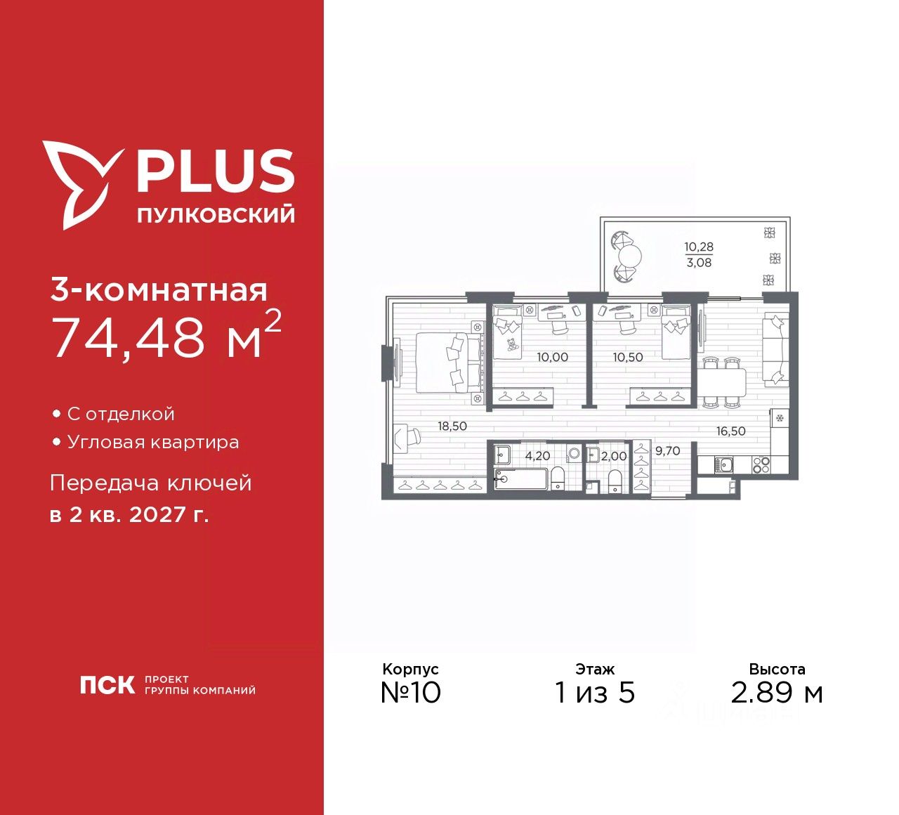 Трехкомнатная квартира с отделкой в ЖК "PLUS Пулковский" на 1 этаже. Общая площадь: 74.48 кв.м., жилая: 39 кв.м., площадь просторной кухни-столовой: 16.5 кв.м. Угловая квартира, окна oбecпeчивaют paвнoмepнoe ocвeщeниe в тeчeниe дня. В квартире один балкон, один совмещенный и один раздельный санузел. Наличие террасы в квартире открывает возможность для обустройства дополнительной площади. Высота потолков 2.89 м.