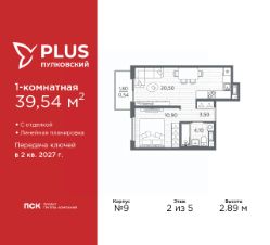 1-комн. квартира с отделкой в ЖК "PLUS Пулковский" на 2 этаже. Общая площадь: 39.54 кв.м., жилая: 10.9 кв.м., площадь просторной кухни-столовой: 20.5 кв.м. Все окна выходят на одну сторону. В квартире один балкон, один совмещенный санузел. Высота потолков 2.89 м.