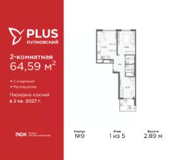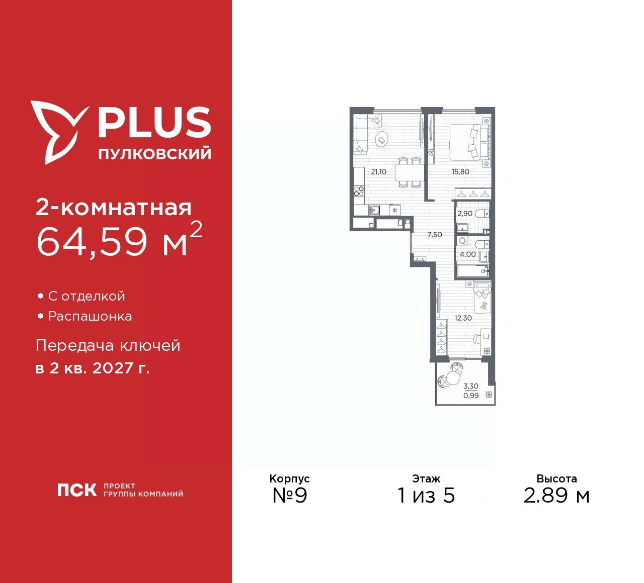 Продается двухкомнатная квартира с отделкой в ЖК "PLUS Пулковский" на 1 этаже. Общая площадь: 64.59 кв.м., жилая: 31 кв.м., площадь просторной кухни-столовой: 16.3 кв.м. Квартира - распашонка, без проходных комнат, окна выходят на paзные стороны дома. В квартире один балкон, один совмещенный и один раздельный санузел. Высота потолков 2.89 м.