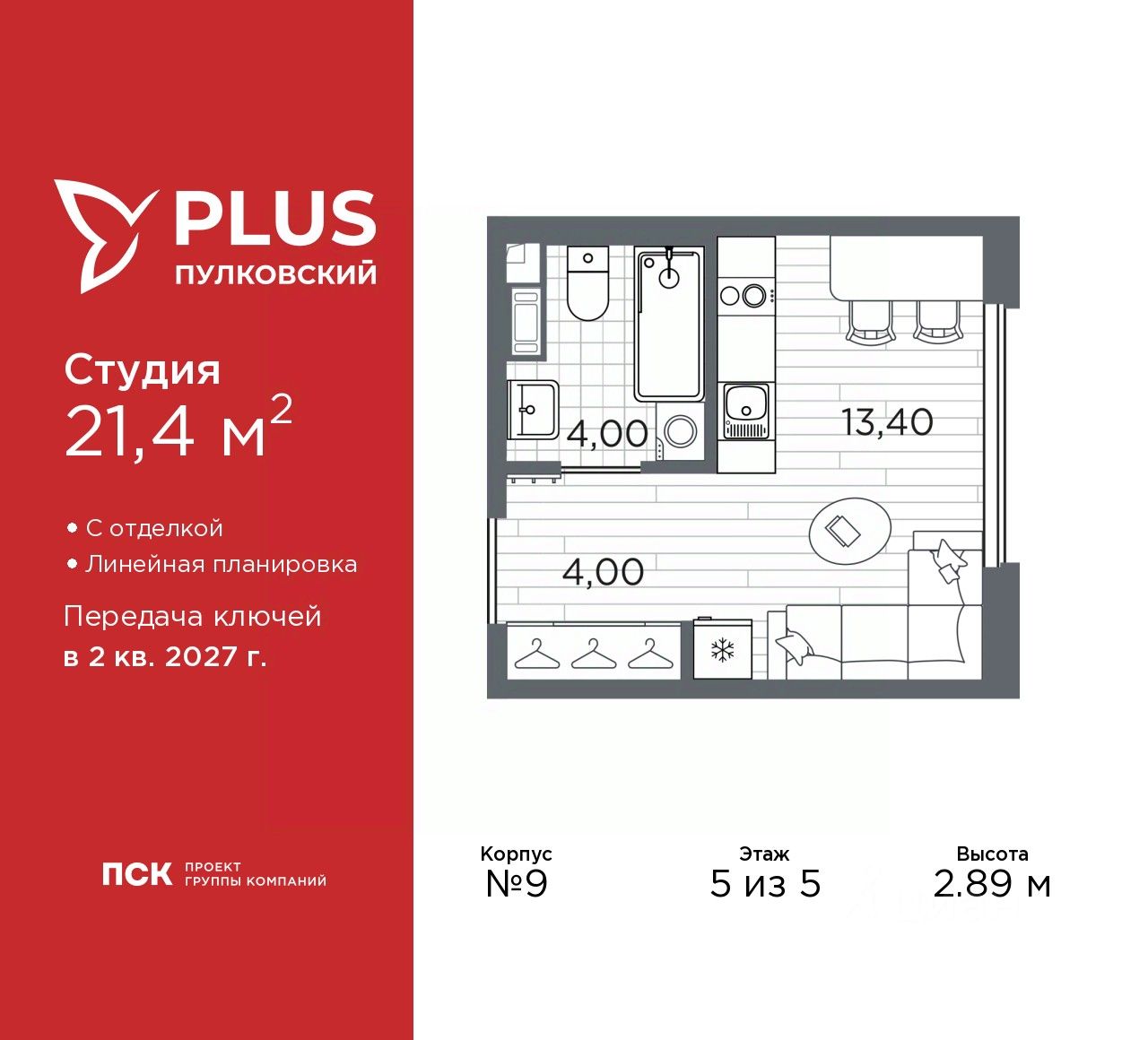 Просторная однокомнатная квартира-студия с отделкой в ЖК "PLUS Пулковский" на 5 этаже. Общая площадь: 21.4 кв.м., площадь гостиной 13.4 кв.м., из которых 5 кв.м. выделено под кухонную зону. Все окна выходят на одну сторону. В квартире один совмещенный санузел. Высота потолков 2.89 м.