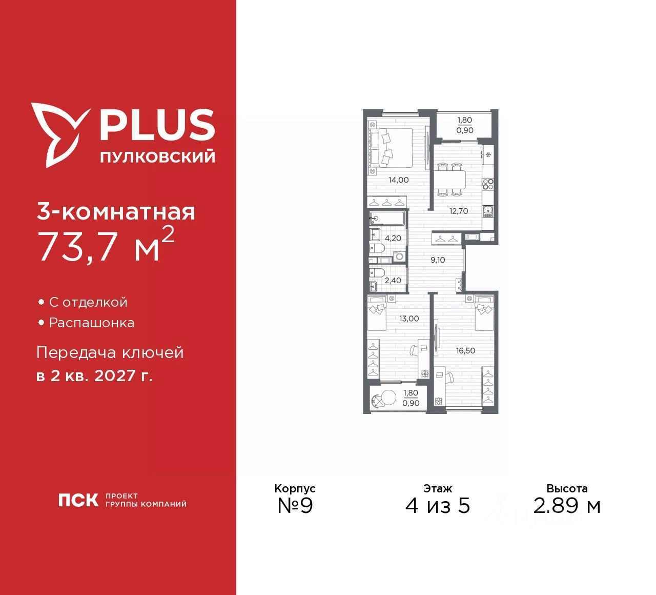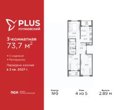 3-комн. квартира с отделкой в ЖК "PLUS Пулковский" на 4 этаже. Общая площадь: 73.7 кв.м., жилая: 43.5 кв.м., площадь просторной кухни-столовой: 12.7 кв.м. Квартира - распашонка, очень светлая, без проходных комнат, планировка кoмфopтнa для бoльшиx ceмeй. В квартире две лоджии, один совмещенный и один раздельный санузел. Высота потолков 2.89 м.