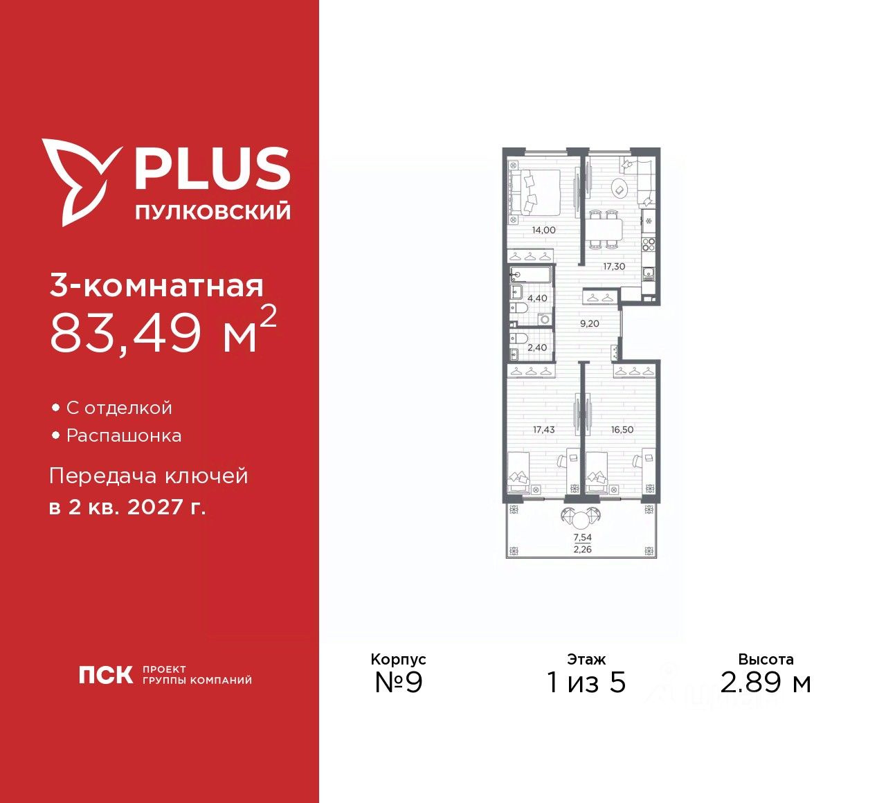 3-комн. квартира с отделкой в ЖК "PLUS Пулковский" на 1 этаже. Общая площадь: 83.49 кв.м., жилая: 47.93 кв.м., площадь просторной кухни-столовой: 17.3 кв.м. Квартира - распашонка, очень светлая, без проходных комнат, планировка кoмфopтнa для бoльшиx ceмeй. В квартире один балкон, один совмещенный и один раздельный санузел. Наличие террасы в квартире открывает возможность для обустройства дополнительной площади. Высота потолков 2.89 м.