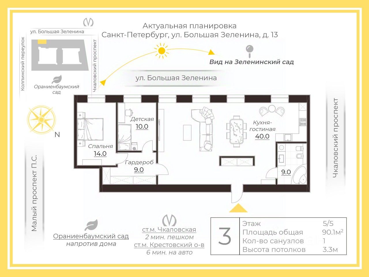 * Светлая и просторная: Высокие потолки (3,25 м) и шесть окон с видом на Зеленинский сад.