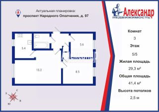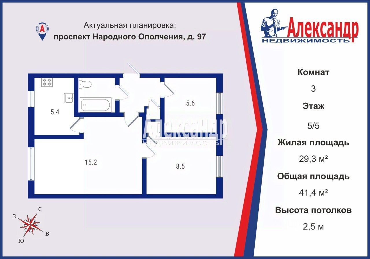 Трехкомнатная квартира общей площадью 41,4 кв.м., две изолированные спальни 8,5+5,6 кв.м, просторная гостиная 15,2 кв.м, кухня 5,4 кв.м, санузел совмещенный. Функциональная планировка позволяет выполнить в помещениях ремонт и оборудовать их с учётом всех Ваших пожеланий.