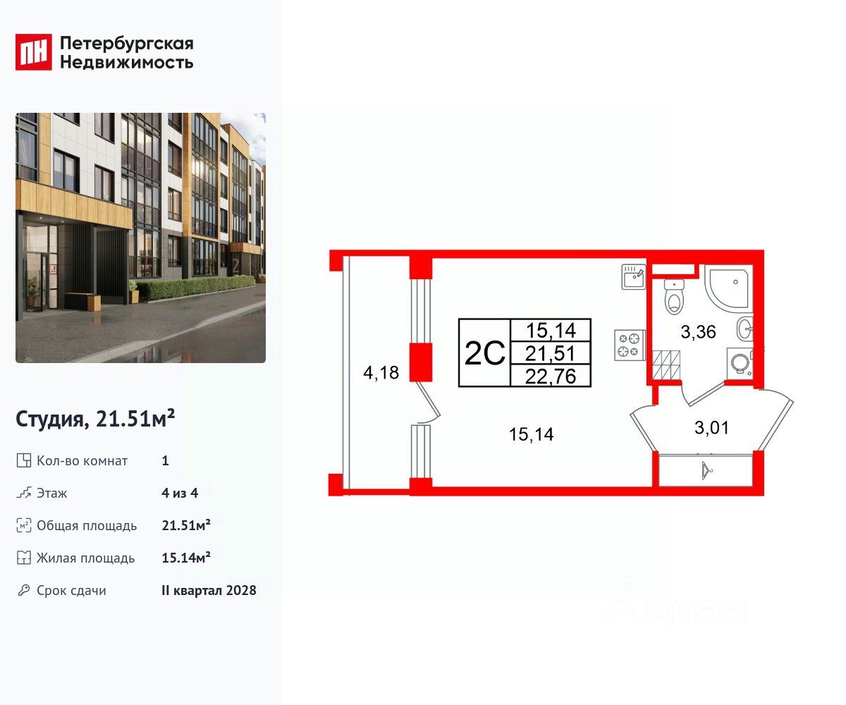 Удобная, классическая, функциональная европланировка, вместительная прихожая 3.01 м². Общая площадь студии - 21.51 м², жилая 15.14 м², высота потолка 3.07 м.