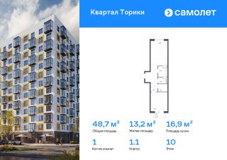 Строим кварталы для жизни с заботой о будущем. Предлагается 1-комнатная квартира комфорт-класса 48,73 кв.м в корпусе 1.1 на 10 этаже, в ЖК "Квартал Торики"