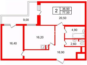 Квартира расположена на 3 этаже. Общая площадь квартиры 77,5м2. Большая 9м2 застекленная лоджия. Комнаты раздельные - спальня 16,4 м2 и гостиная 20,5м2. Просторная кухня - столовая 16,2м2, оснащенная современной техникой. Высота потолков 2,75м.