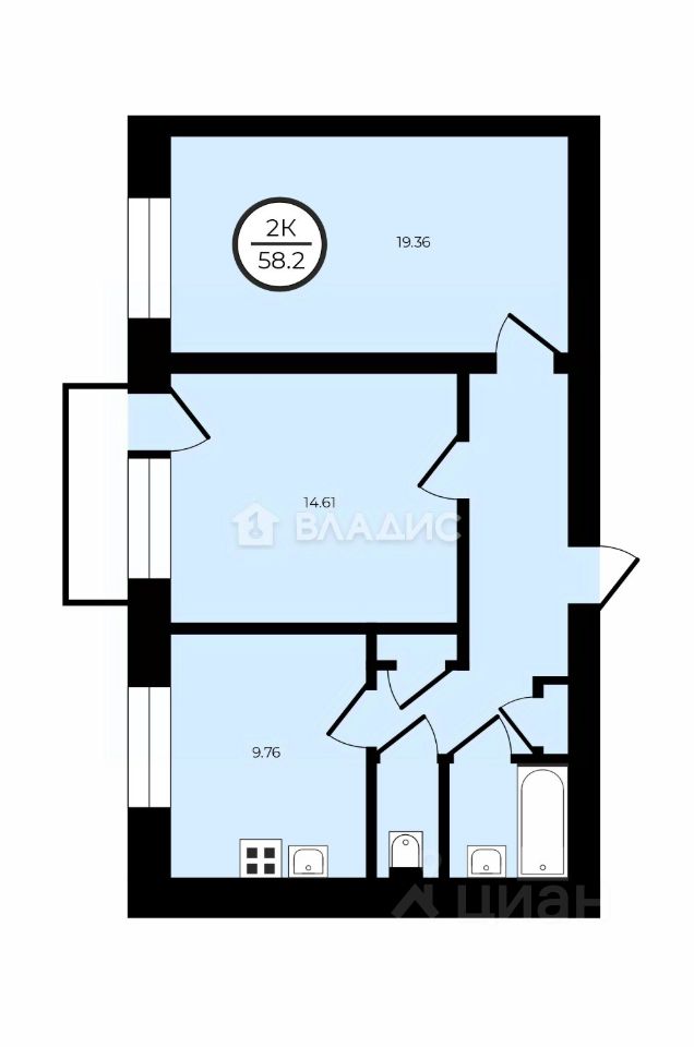Общая площадь квартиры составляет 58,2 кв. м, жилая — 33,97 кв. м, площадь кухни — 9,76 кв. м. Комнаты изолированы, их площади — 14,61 кв. м и 19,36 кв. м.